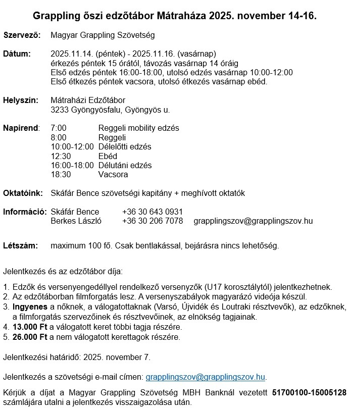 | Jelentkezés: | Edzők és versenyengedéllyel rendelkező versenyzők (U17 korosztálytól) jelentkezhetnek. Jelentkezés a szövetségi e-mail címen: grapplingszov@grapplingszov.hu Jelentkezési határidő: 2025. november 7. |
