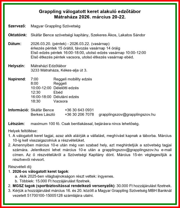 | Fizetés: | Kérjük a hozzájárulást március 16. és 20. között a Magyar Grappling Szövetség MBH Banknál vezetett 51700100-15005128 számlájára utalni. |